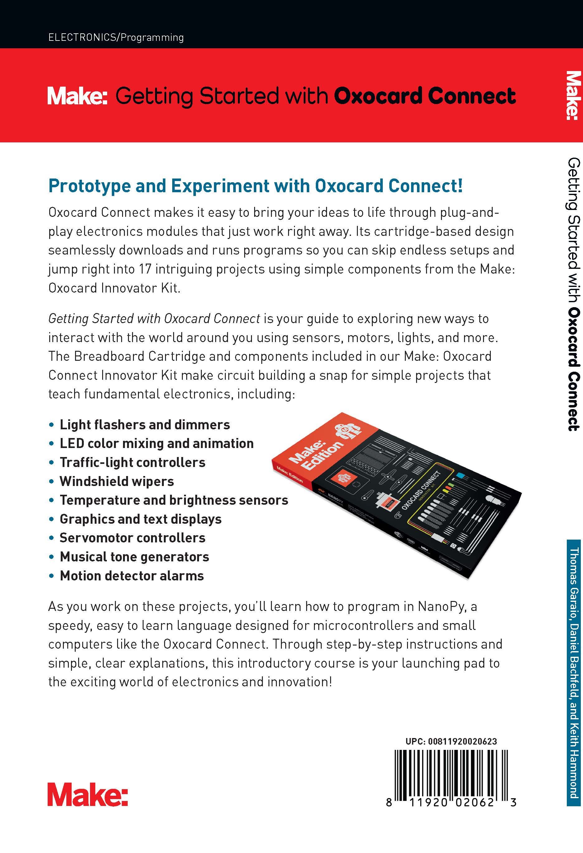 Getting Started with Oxocard Connect is your guide to exploring new ways to interact with the world around you using sensors, motors, lights, and more. The Breadboard Cartridge and components included in our Make: Oxocard Connect Innovator Kit make circuit building a snap for simple projects that teach fundamental electronics, including: