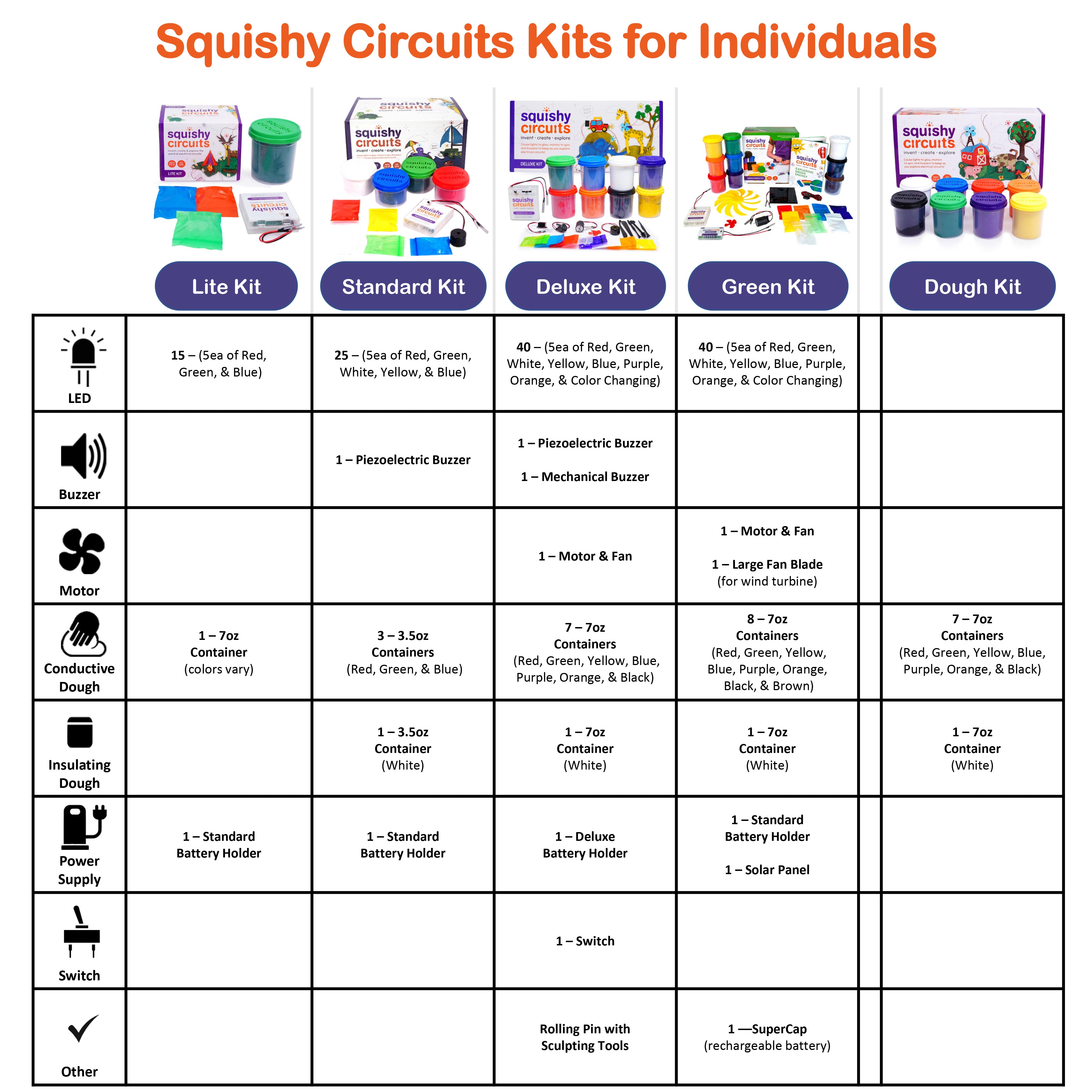 The dough kit includes 7 containers of conductive dough and 1 container of white insulating dough! Each container holds 7 ounces (a normal, bought container is 5 ounces). The dough does contain gluten, but is safe and non-toxic. The conductive dough does dry out if left out of the container, but the insulating dough does not dry out.