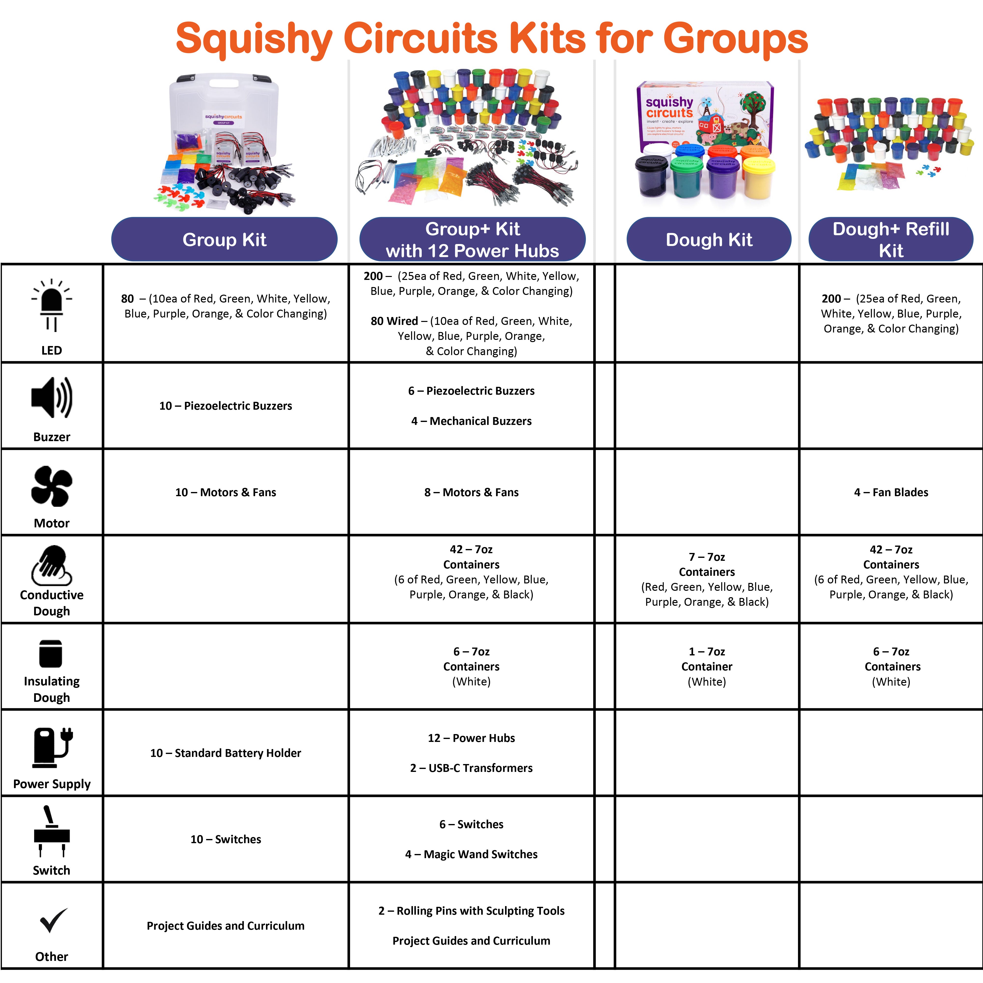 Ensure the creativity never stops! While the Squishy Circuits Group+ Kits come with plenty of dough, frequent use means colors may mix or get dirty over time. The Group+ Refill Kit has you covered with over 25 pounds of fresh dough and a supply of replacement standard LEDs to keep your projects shining bright.