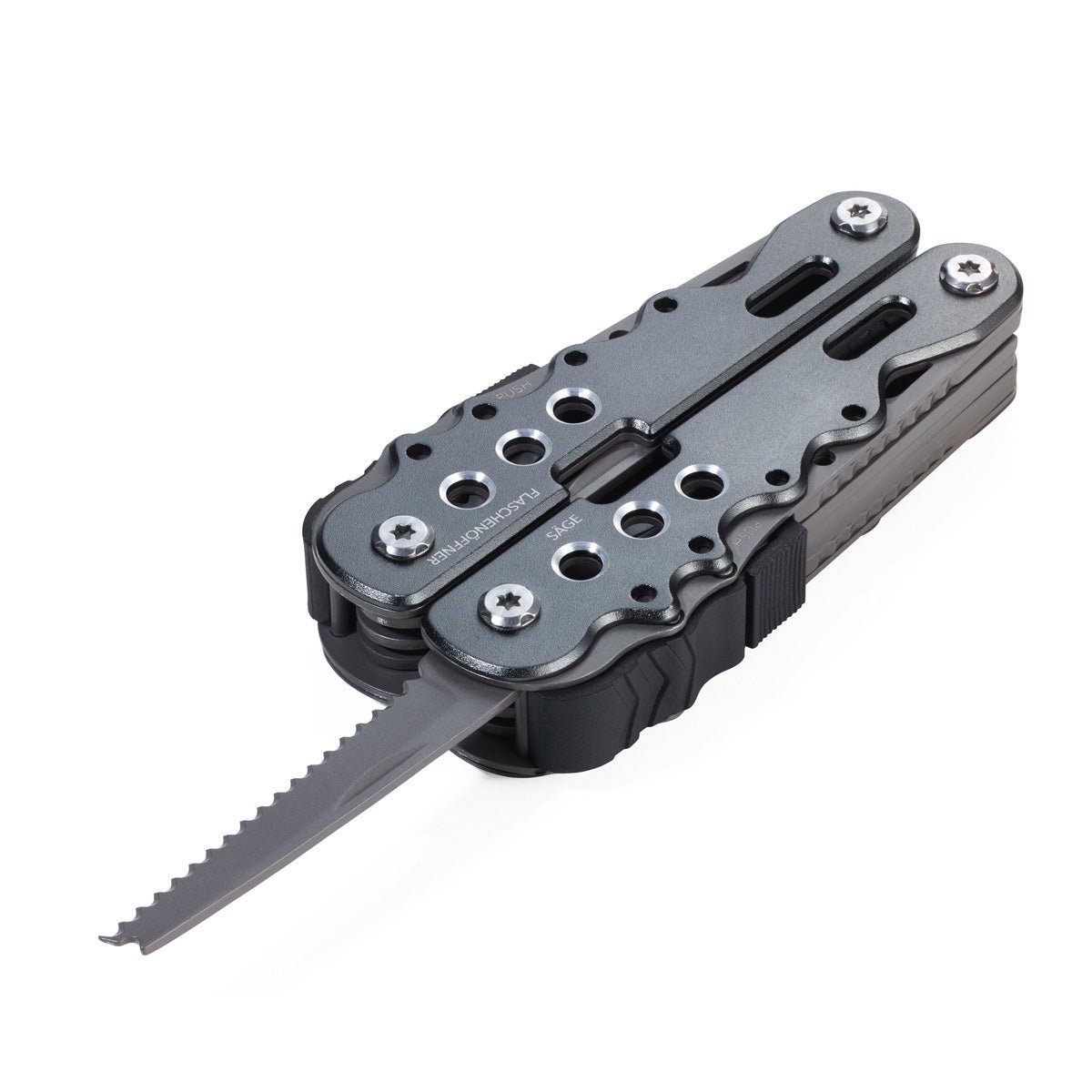 Troika's Arbeitsgeraet, translates out of German as Work Tool and is a great German designed work companion. Be ready to take on a large number of tasks with its ten 420 stainless steel tools in a strong tactical looking anodized aluminum body. Easy locking and unlocking mechanism with thumb sliding buttons. Tools include, pliers, knife, saw blade, bottle opener, can opener, slotted screwdriver (3 sizes) Phillips head screwdriver, wood and metal file, side cutters and awl. This is a great tool to keep in the car, take on a camping trip or be your all around tool for trade show and around the house tasks.