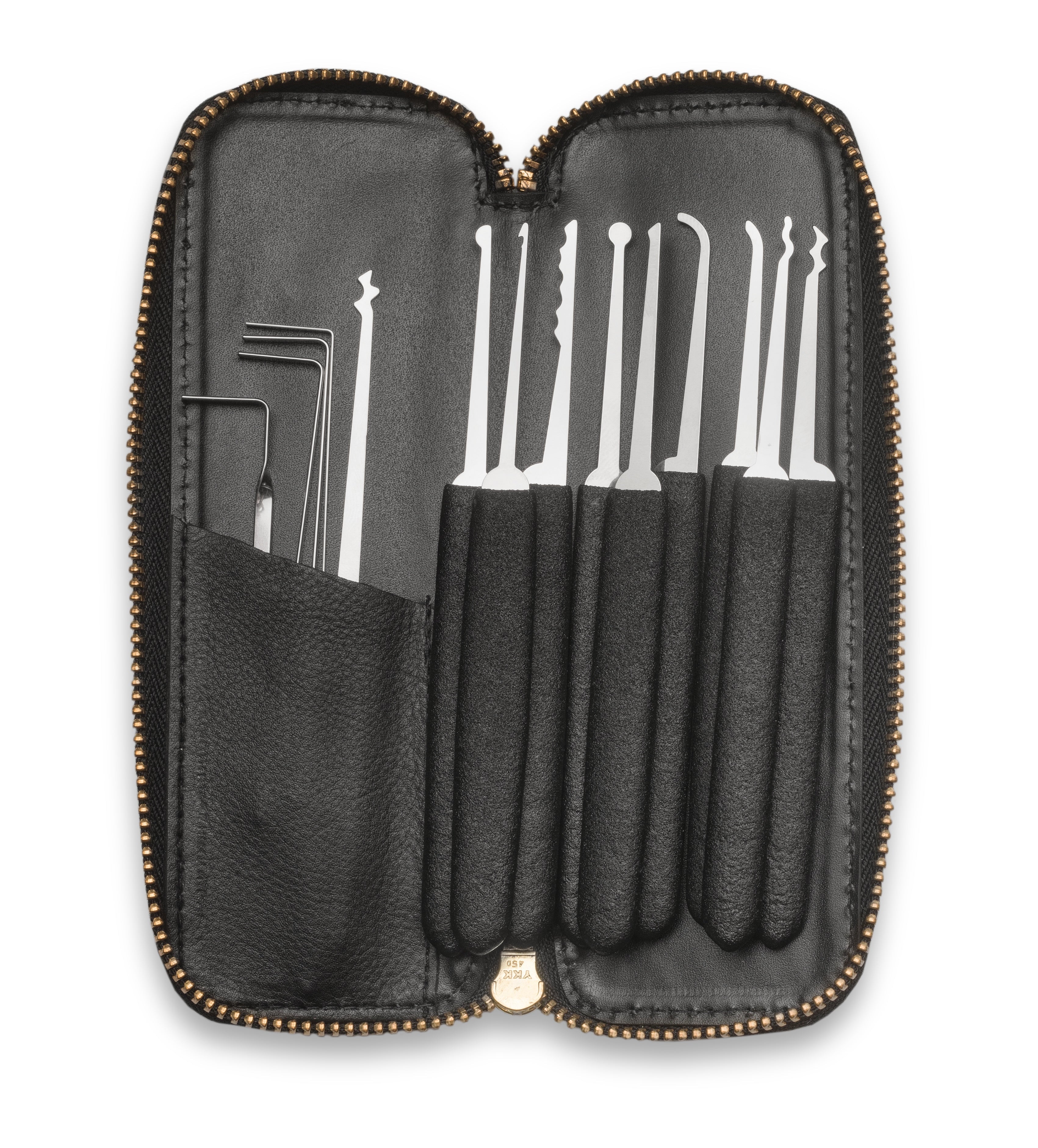 The PXS-14 14-piece lock pick set includes a variety of picks in different styles from our Standard series. The slide-on textured grips help provide comfort, while maintaining feedback inside of the lock when picking.