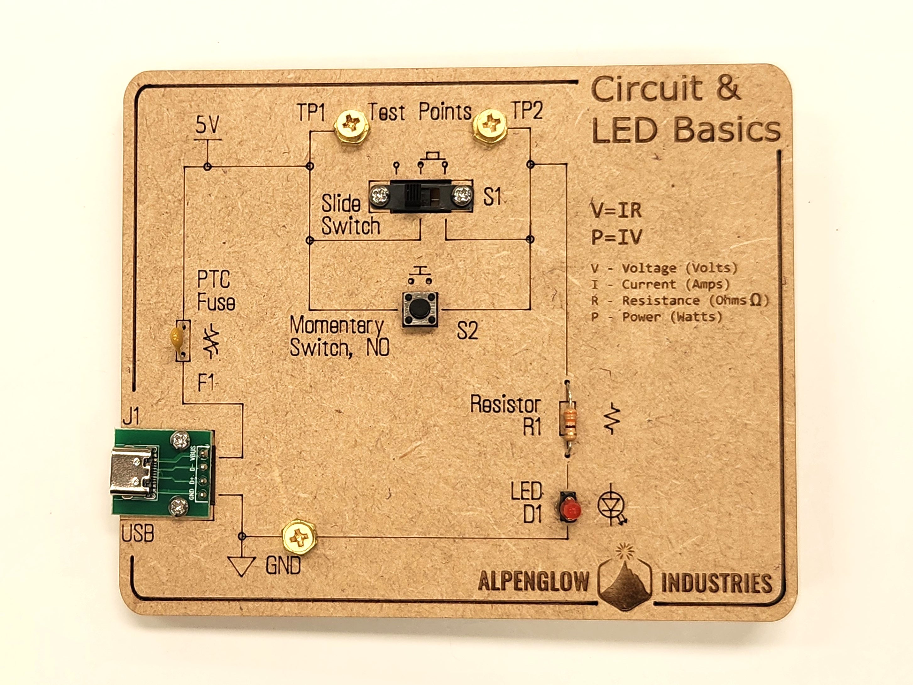 We created these because we wanted something easier to use than a typical grid-style solderless breadboard, which can be difficult for beginners to visualize and understand the hidden connections. In this kit, each component has a marked space, and the schematic symbol is next to each one so you can easily see its electrical symbol and learn how to read a schematic. There are convenient test points that alligator probes easily clip to, for measuring current and voltage. The kit can be powered with any USB supply (a USB-C cable is required), though we recommend a 1A or lower current-limited supply or charger. A resettable fuse is part of the kit, but care should still be taken to prevent a short circuit (5V and GND touching) at the USB connector.