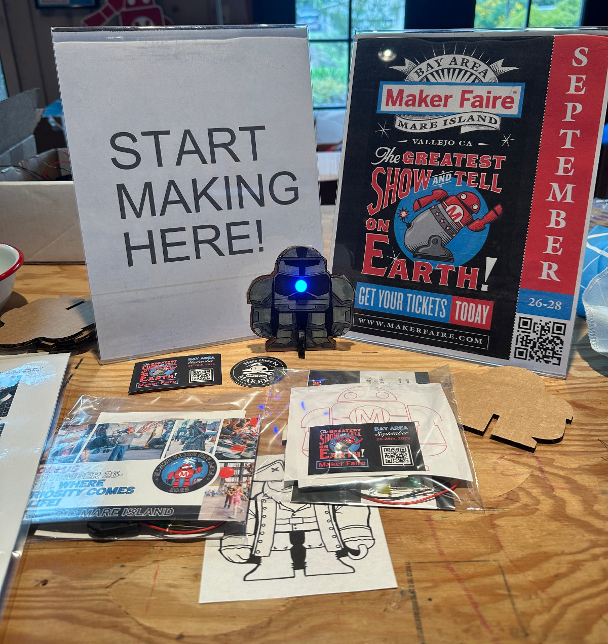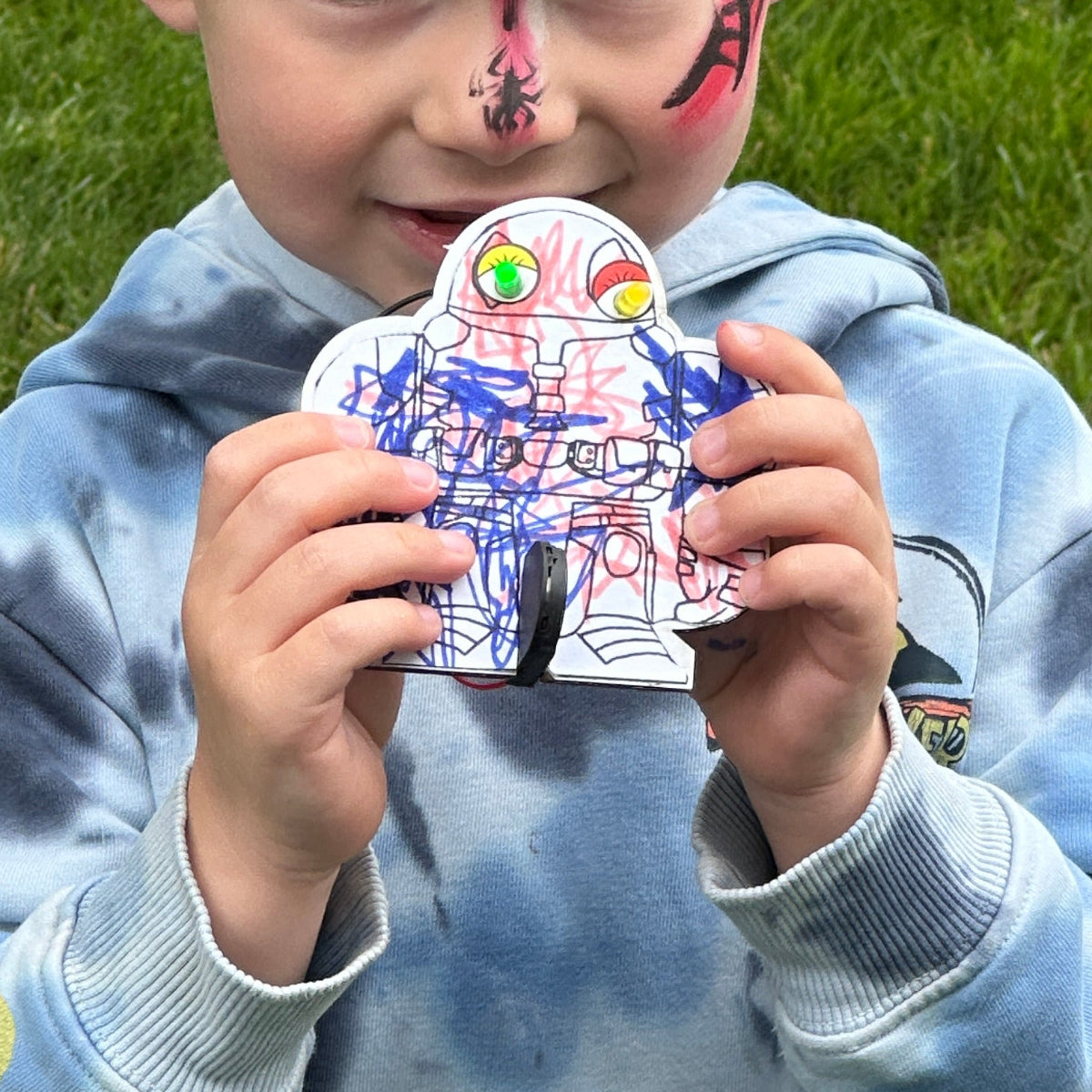 This pack contains materials for one project with many possibilities and requires no soldering. It only needs common tools and supplies such as masking tape, scissors, a small screwdriver or punch for poking a hole in the cardboard, crayons, pencils or colored markers to decorate the different downloadable templates!