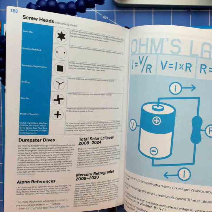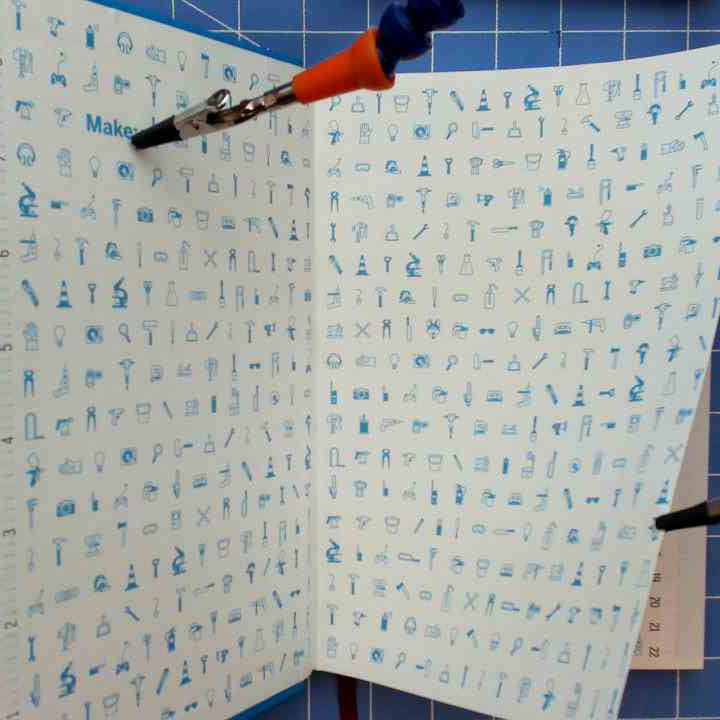The Maker's Notebook contains 150 pages of engineering graph paper as well as bonus pages of useful reference material — from electronics symbols, resistor codes, weights and measures and basic conversions to the amount of caffeine in different beverages and how to say "Hello, World!" in various computer languages. Printed in cyan "Maker" blue with a white grid embossed front and back.
